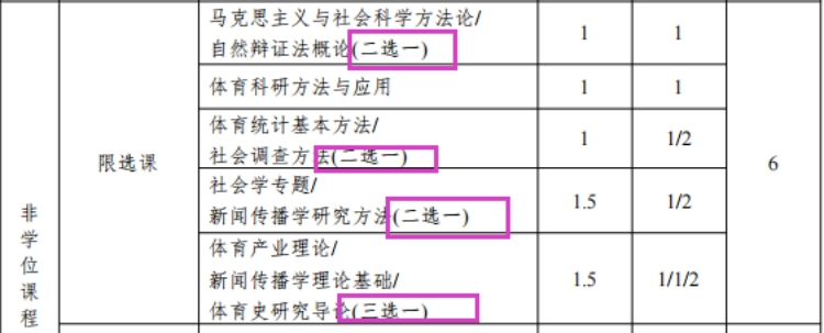 2、课程性质为限选课和选修课由学生选课,可在规定选课时间内退选、补选。其中选修课根据培养方案要求,选满当学期所需学分即可;限选课为必修课程,各学期应修满相应学分,如限选课加有后缀“(二选一)或(三选一)”的课程,则两门或三门课程任选其一即可。培养方案中显示如下图: